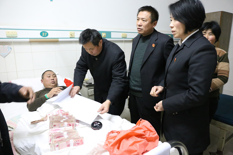 由于被执行人身体不便,且没有办理委托领取赔偿款手续,时至年关,为了让申请人过一个安心年并保证赔偿款的交接安全,近日我院执行局副局长李磊一行亲自将20万赔偿款送到申请人周中领的病榻前。从判决到执行完毕仅仅用了一个月时间。
